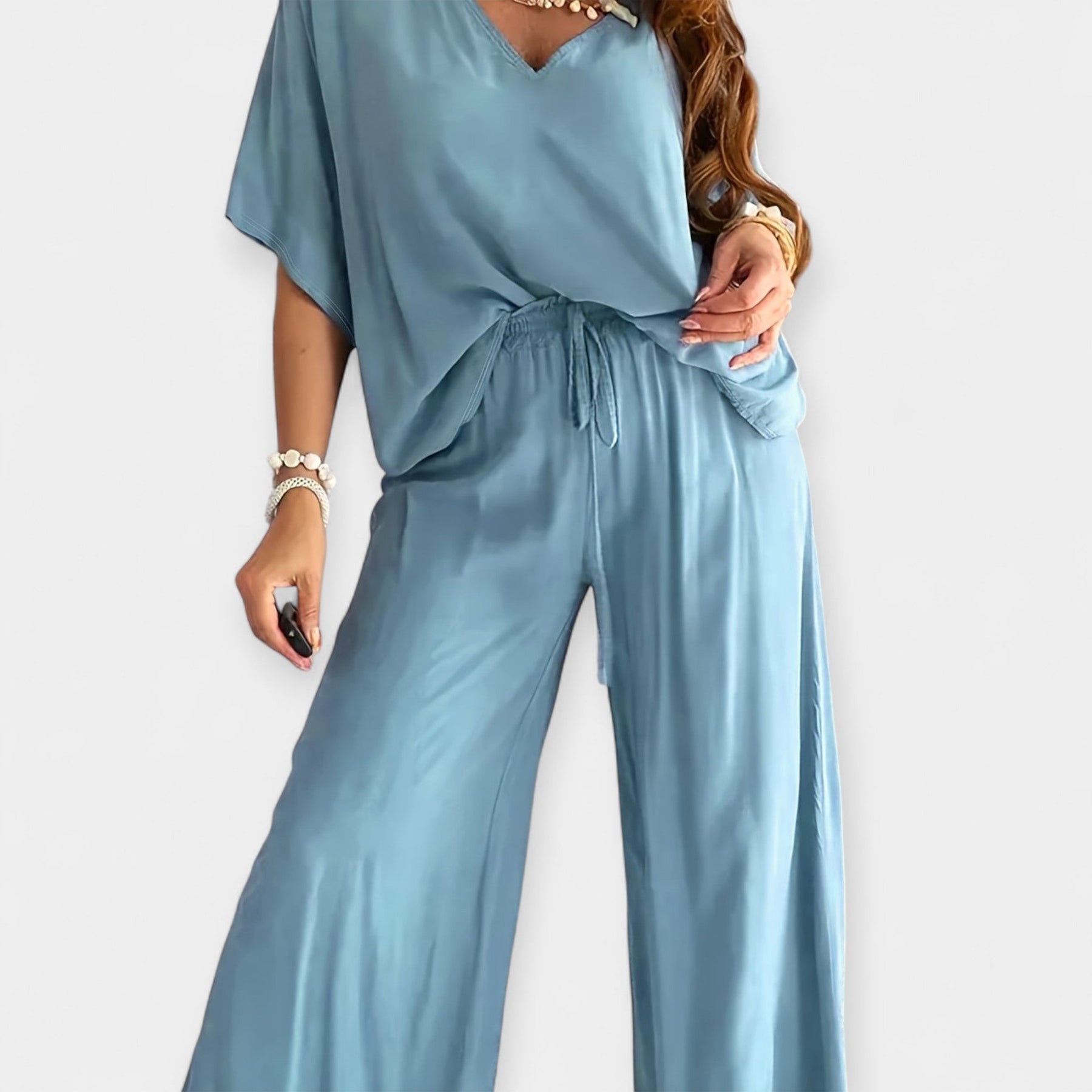 Ta set je vrhunec sproščenega šika! Široke hlače z udobnimi hlačnicami se harmonično kombinirajo z ohlapno bluzo, ki ima V-izrez in široke rokave – za stil, ki diha in poudari vsako postavo.