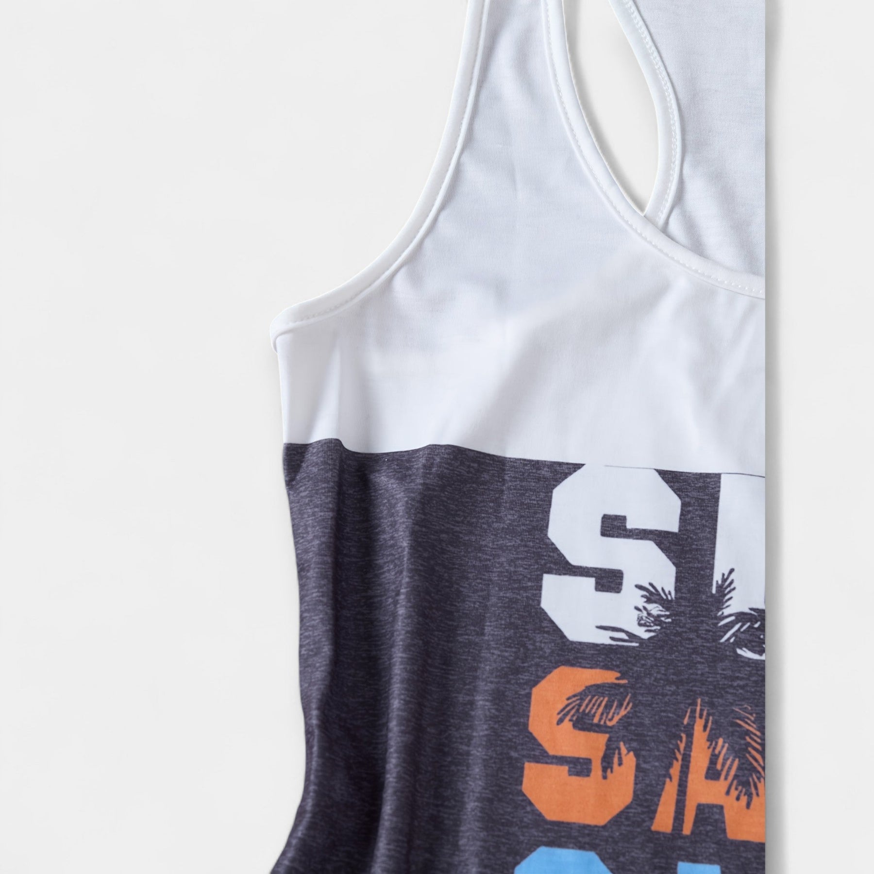 Majica s tropskim potiskom in usklajeni kratki šortki ustvarjata udoben in živahen videz za vsak poletni nastop.