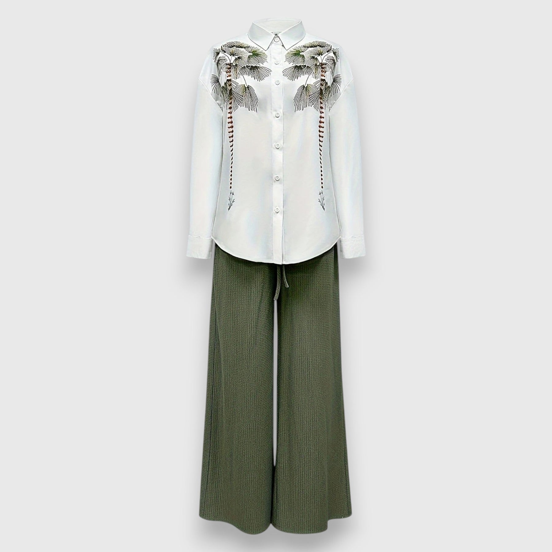 Set Nirvana združuje elegantno bluzo z nežnim cvetličnim vzorcem in zračne hlače širokih nogavic – popolno za stilne dni.